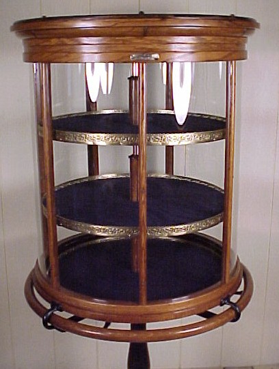 OAK REVOLVING DISPLAY CASE ON IRON BASE