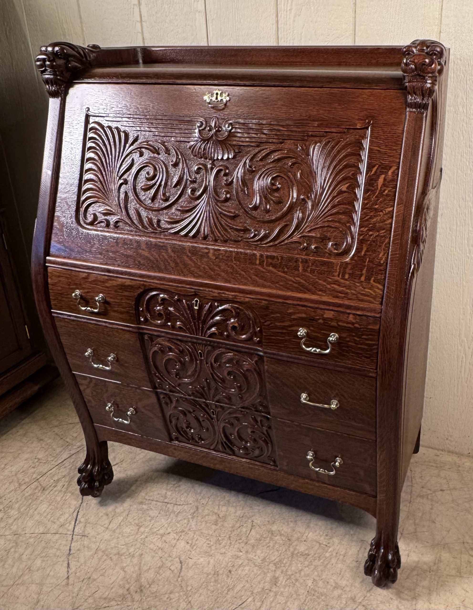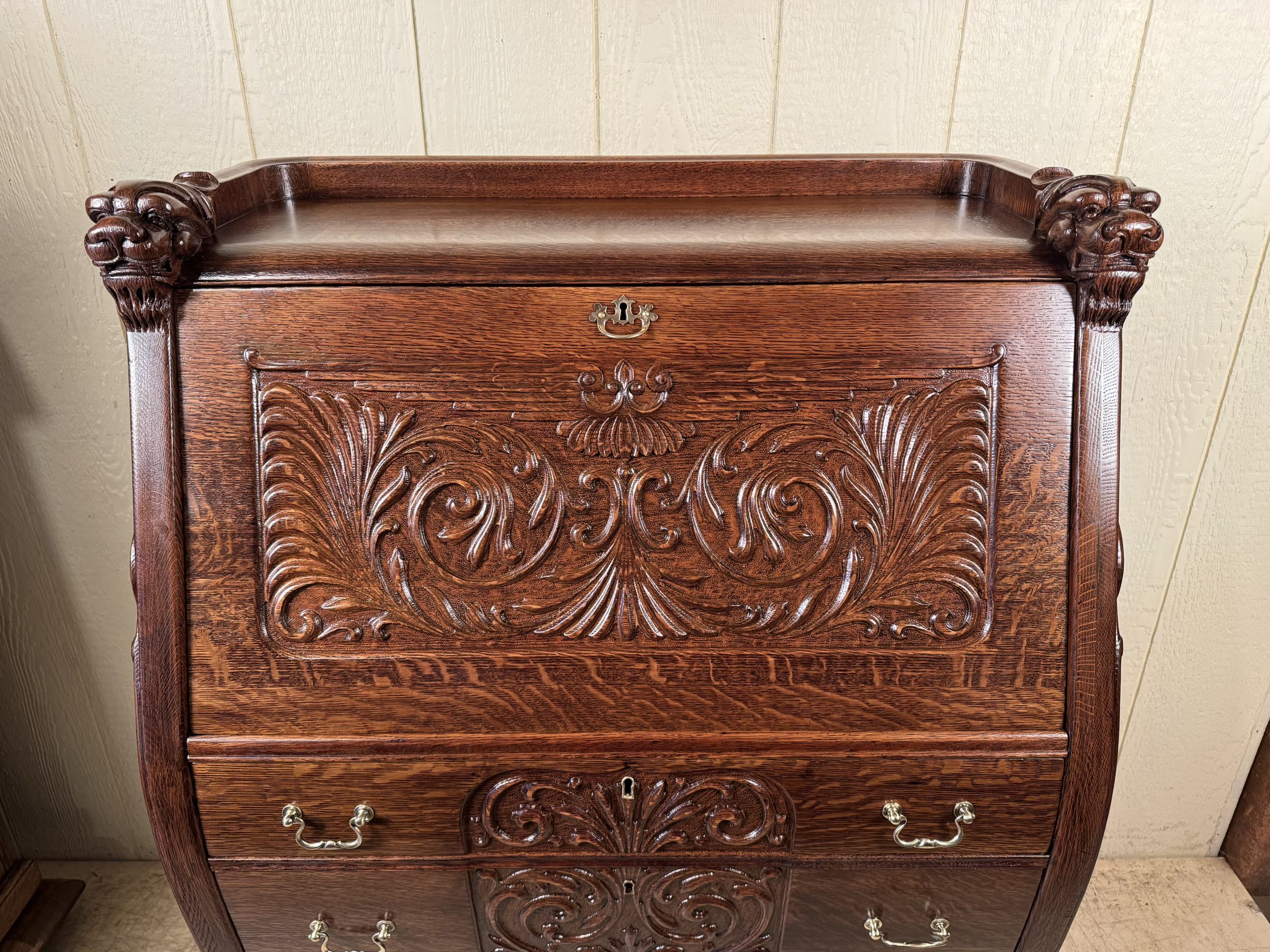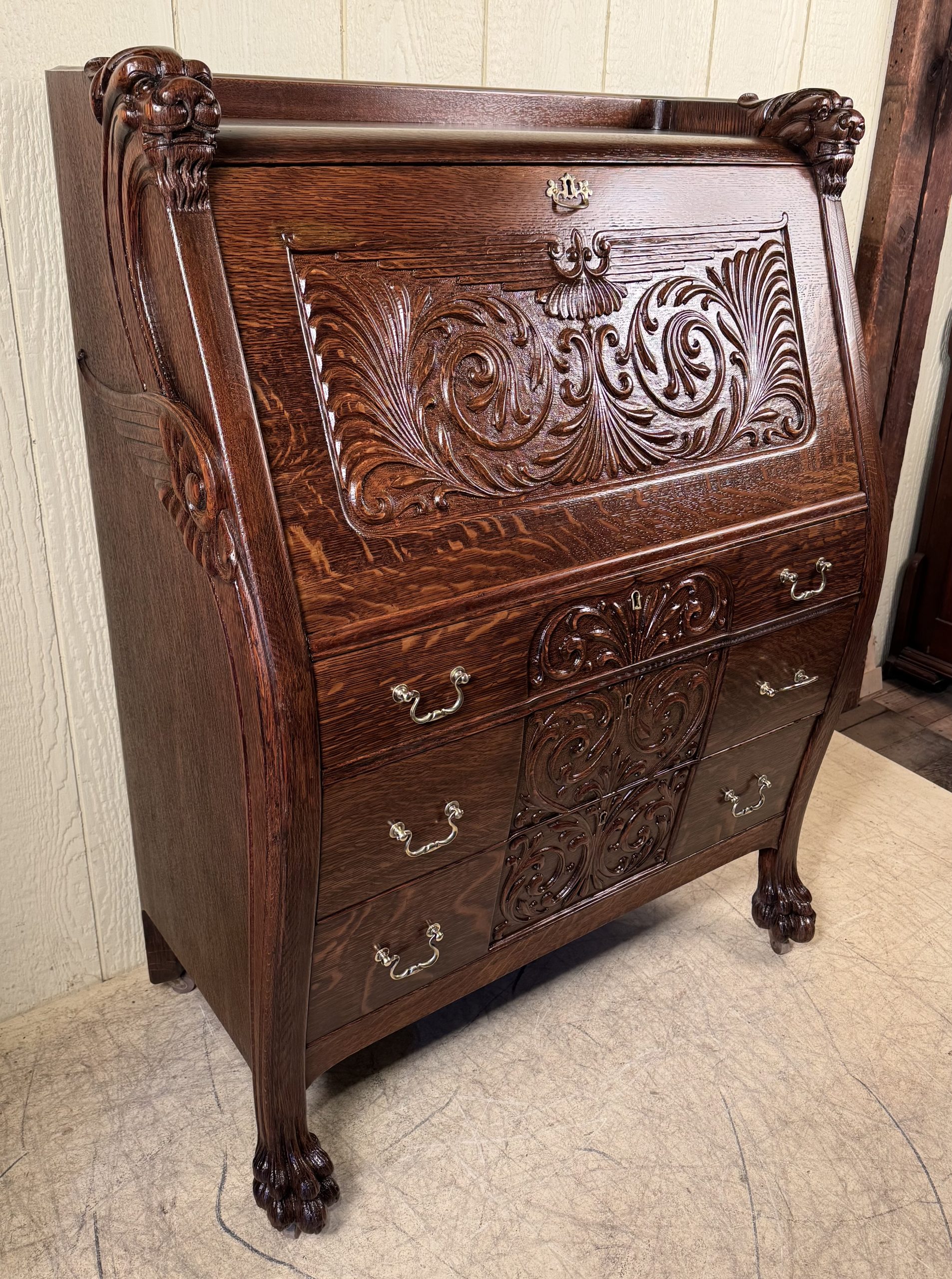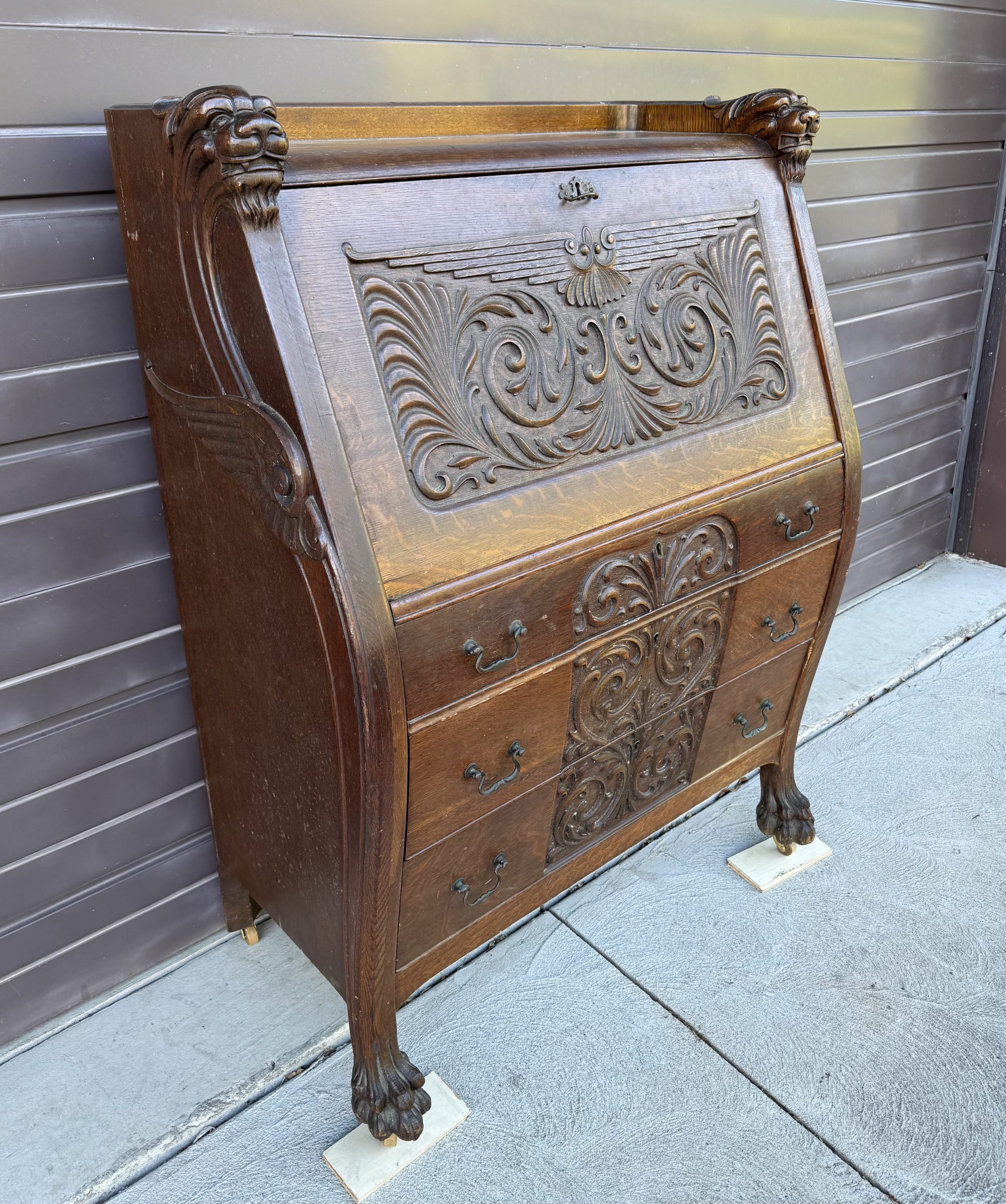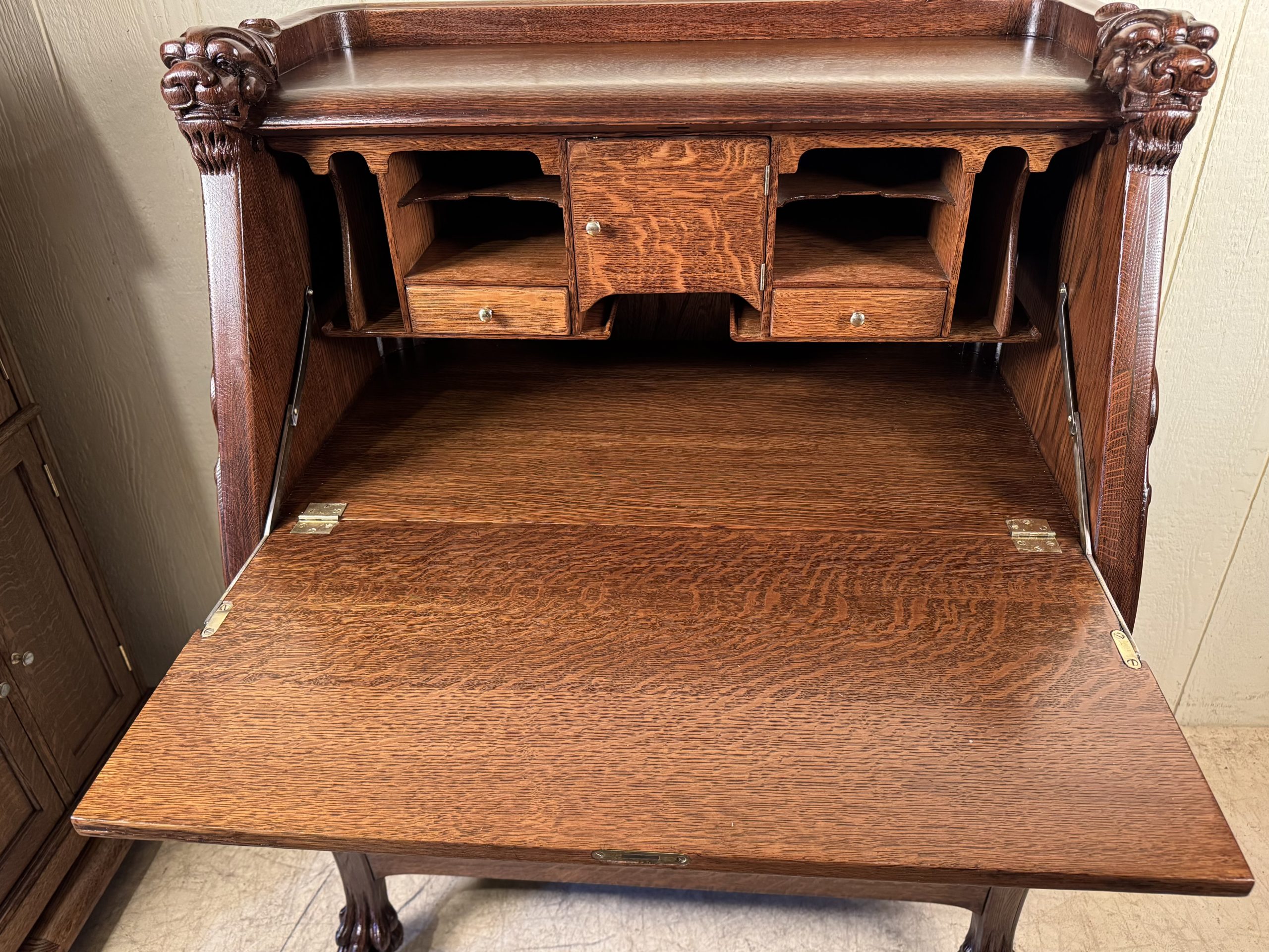 Oak Drop Front Desk with Carved Lion Heads