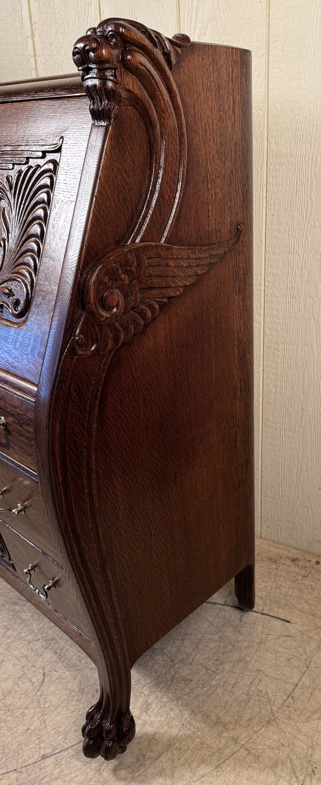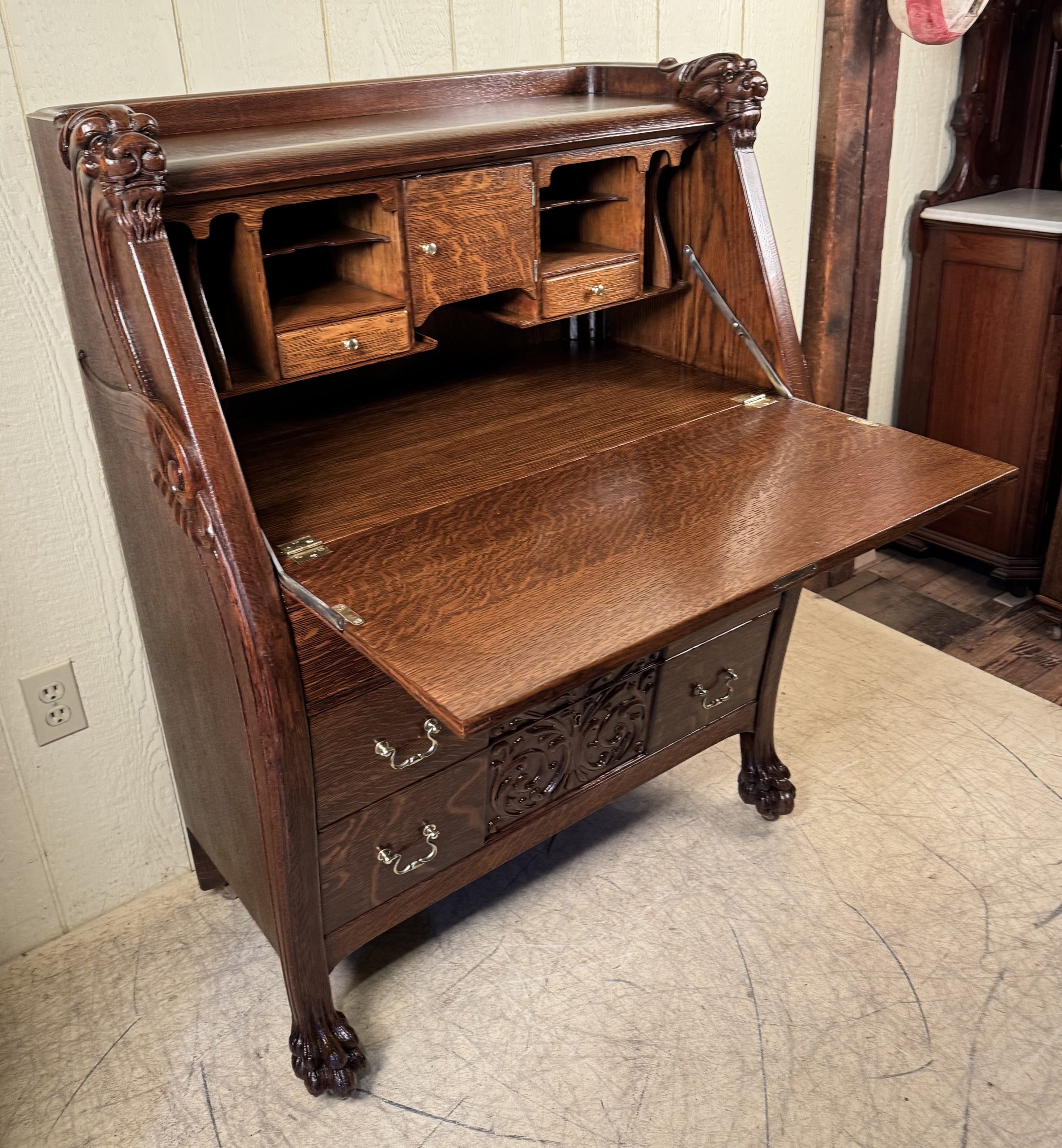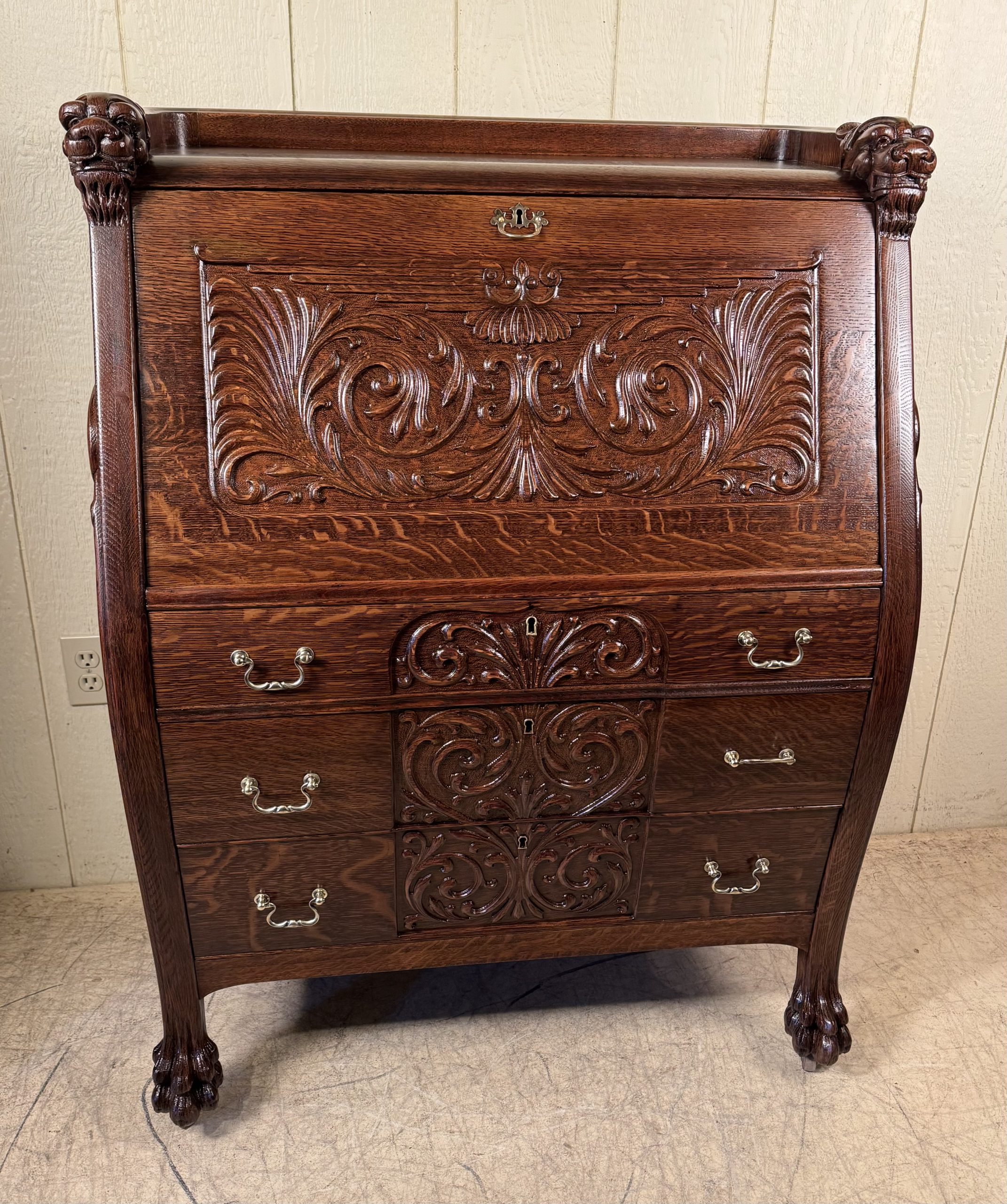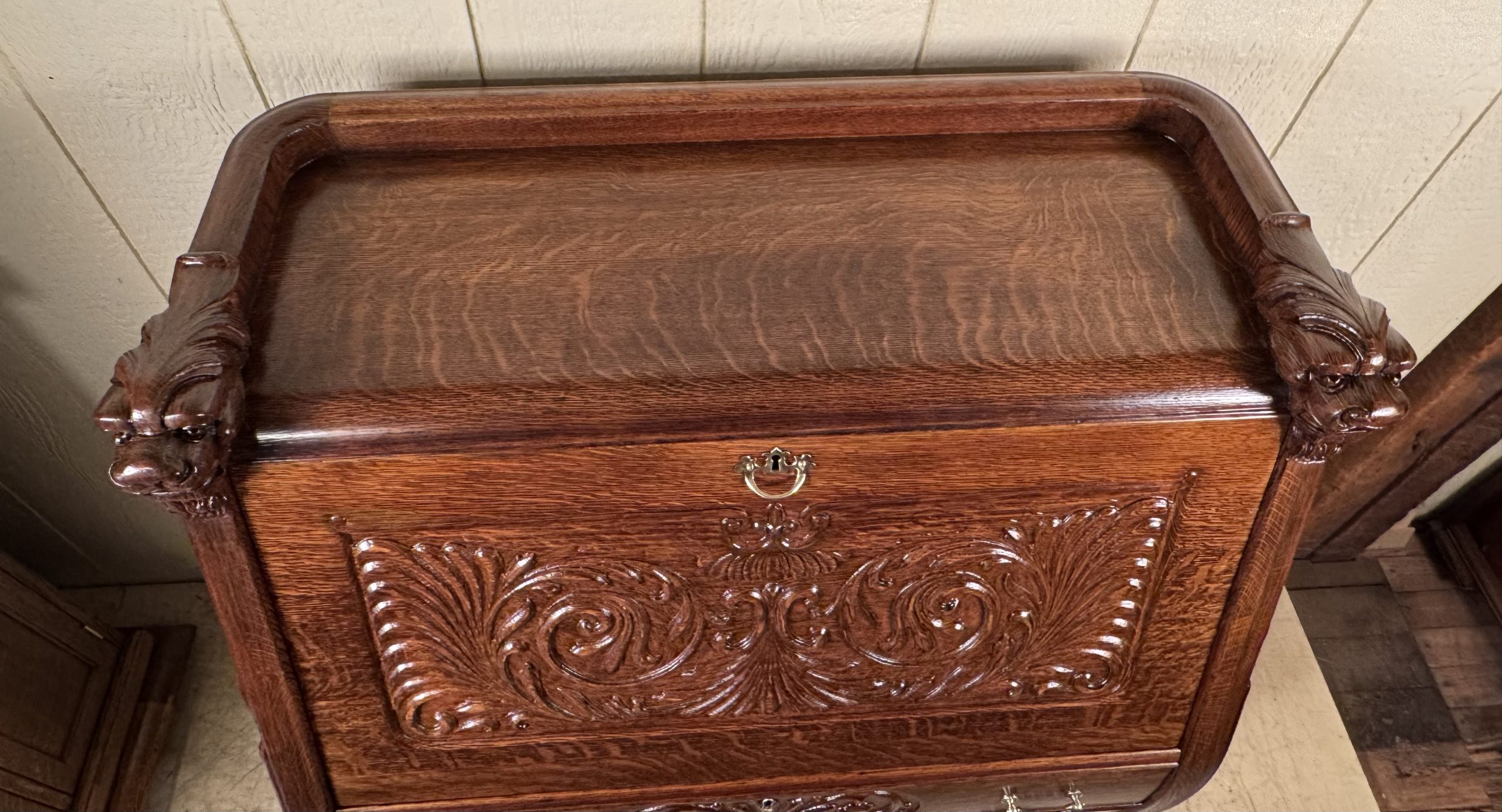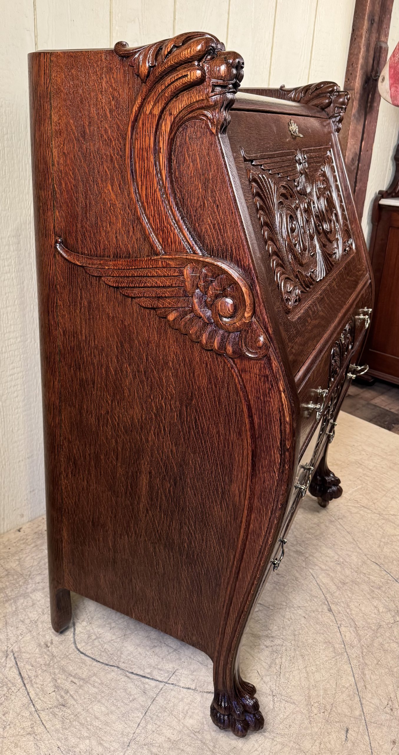 Oak Drop Front Desk with Carved Lion Heads