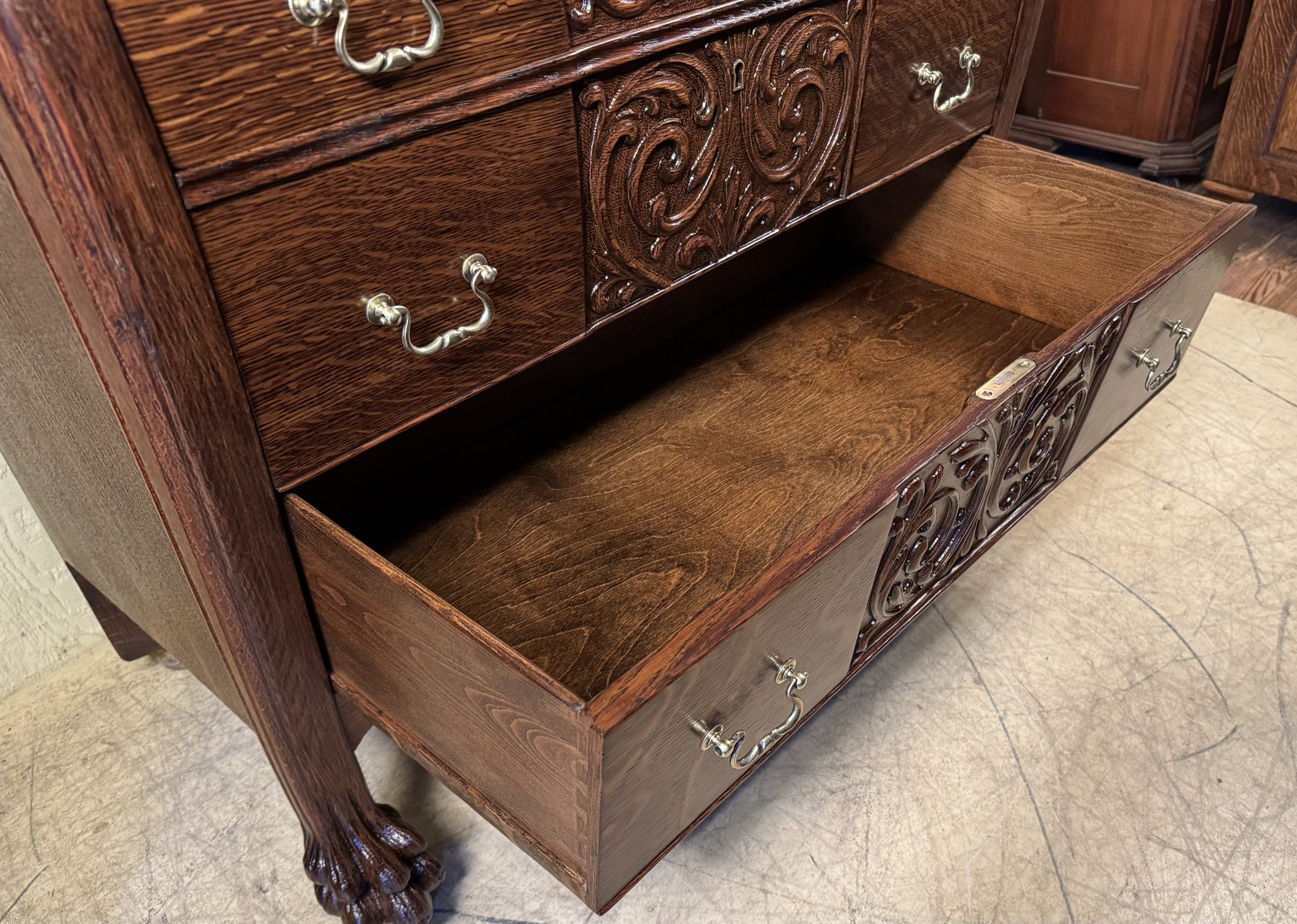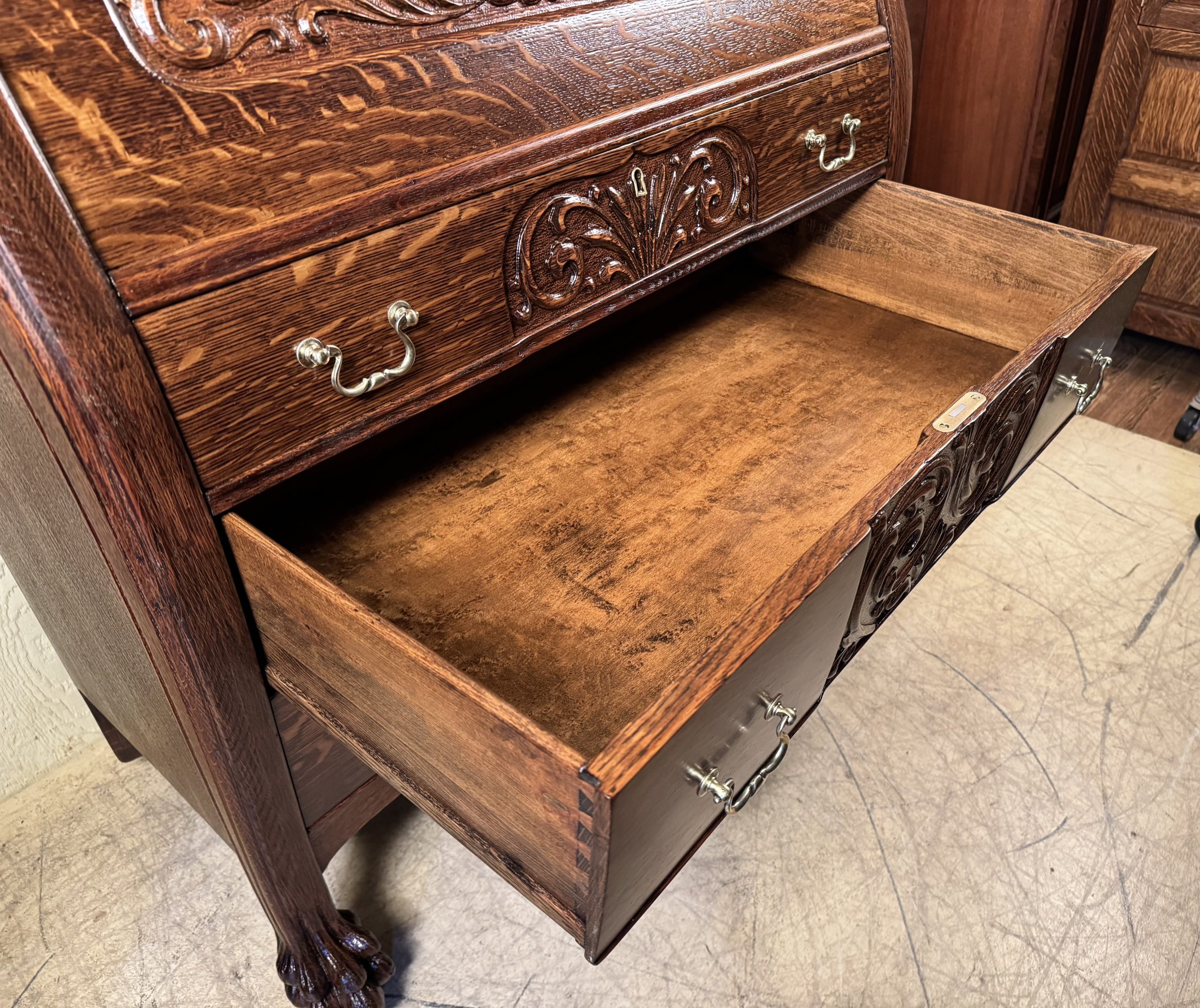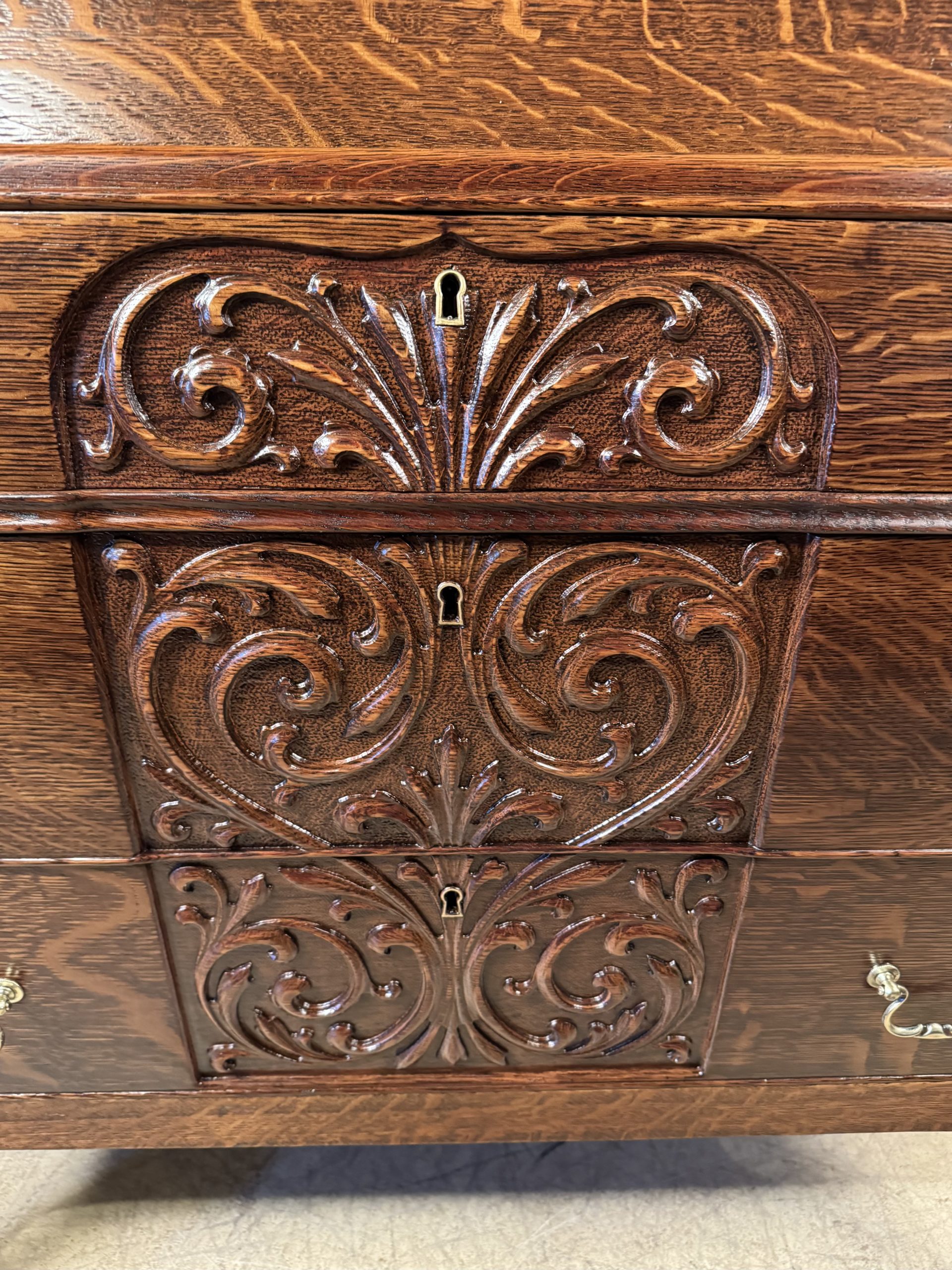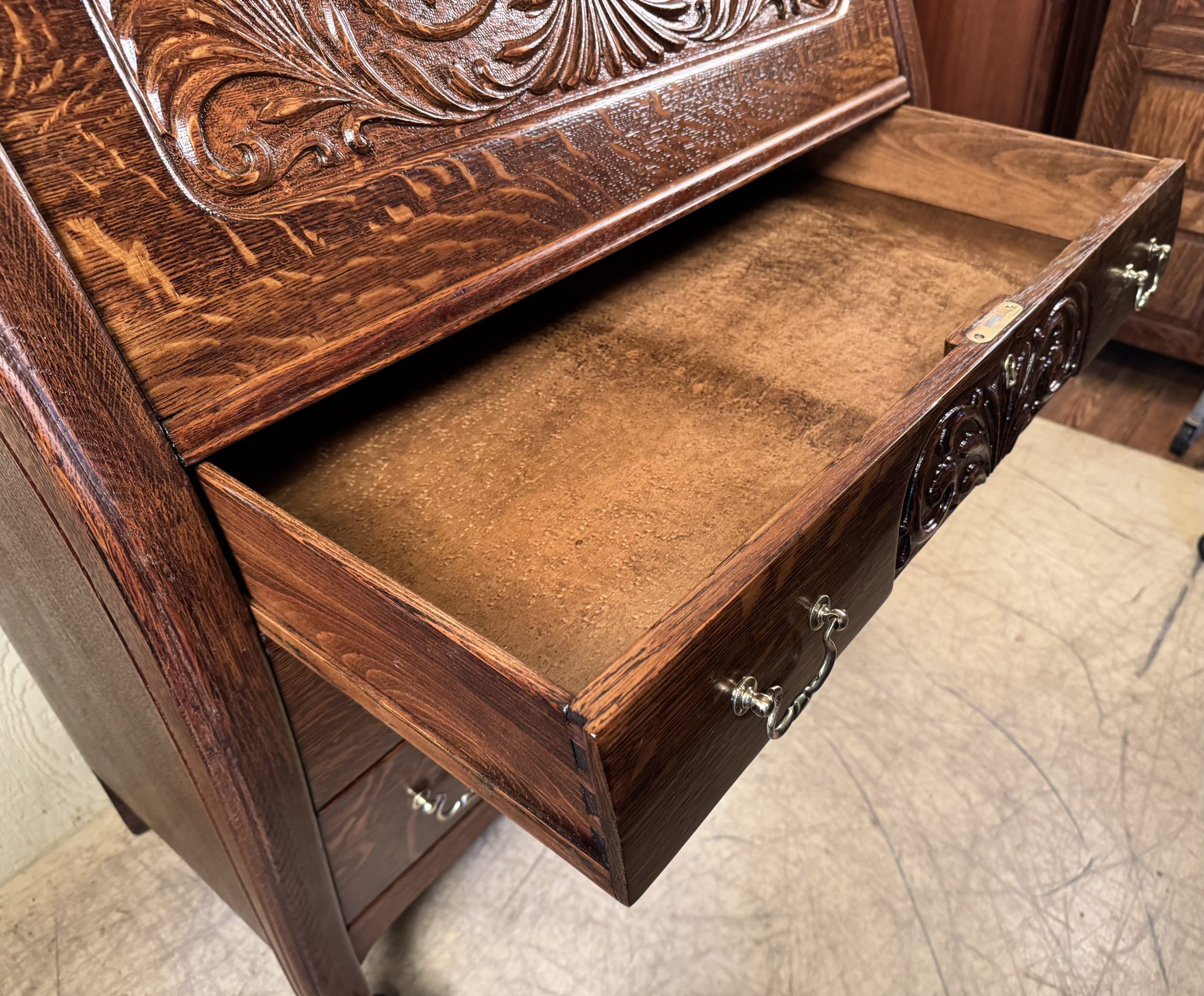 carved sides on all drawer & drop-leaf fronts