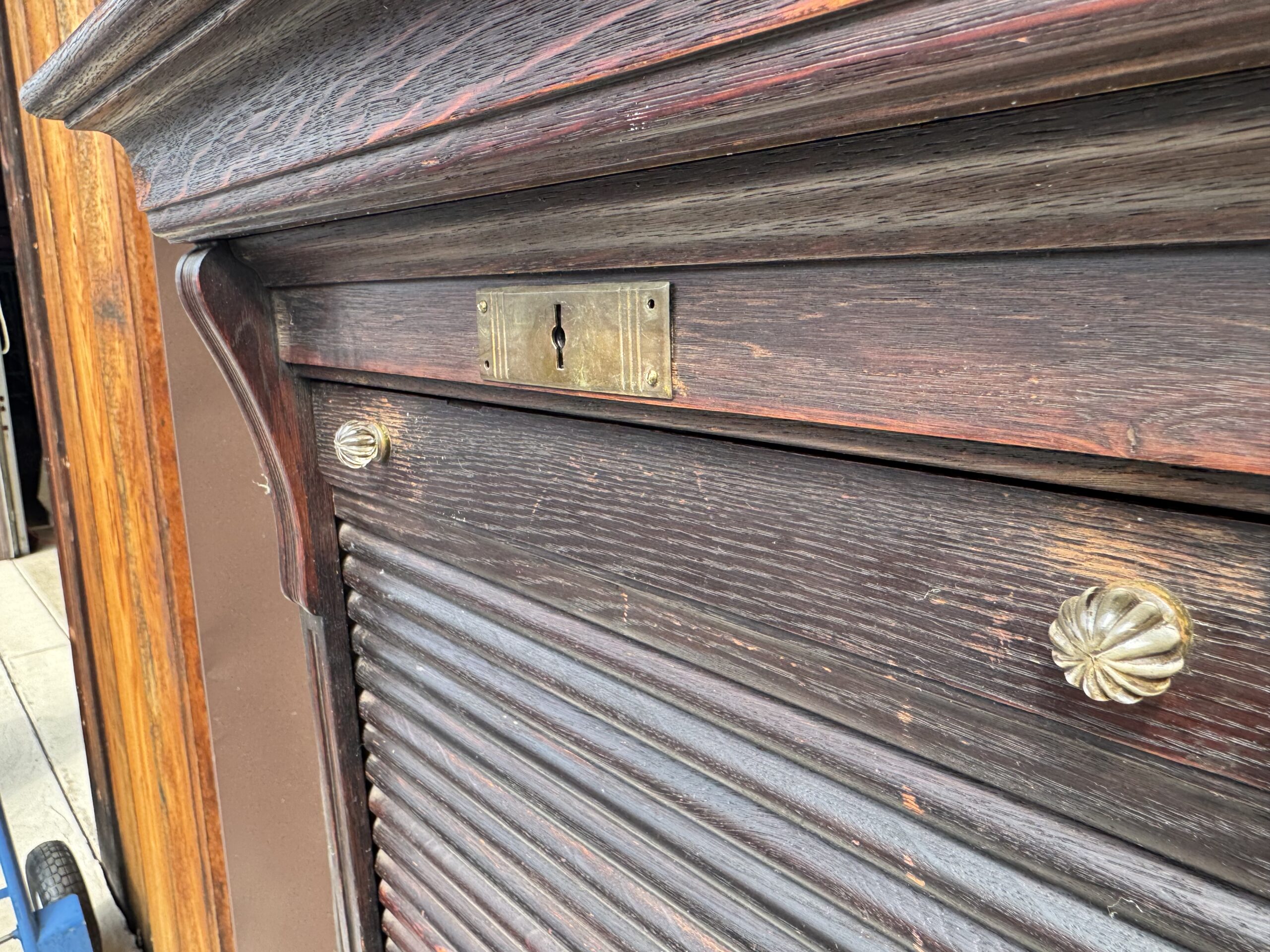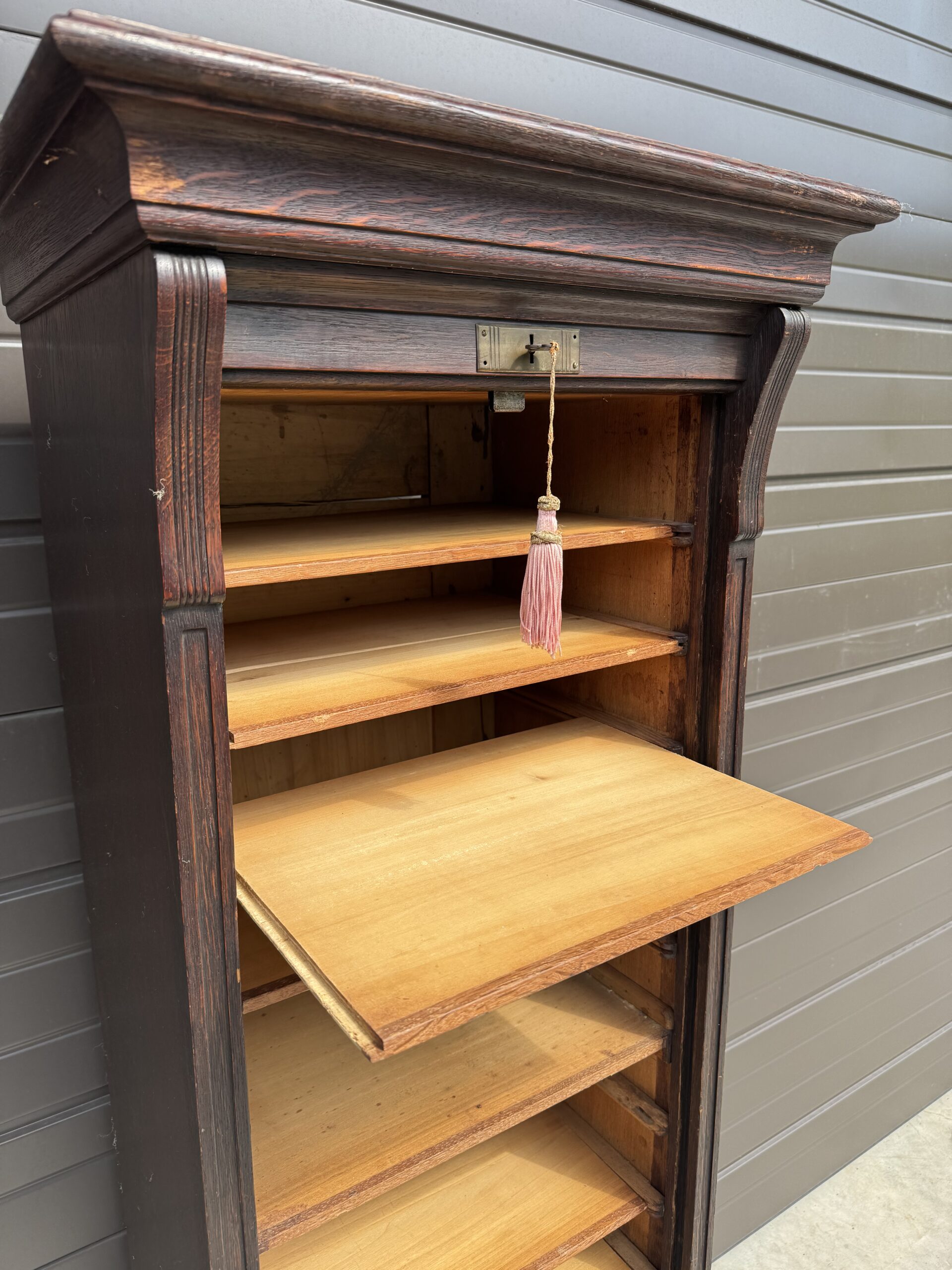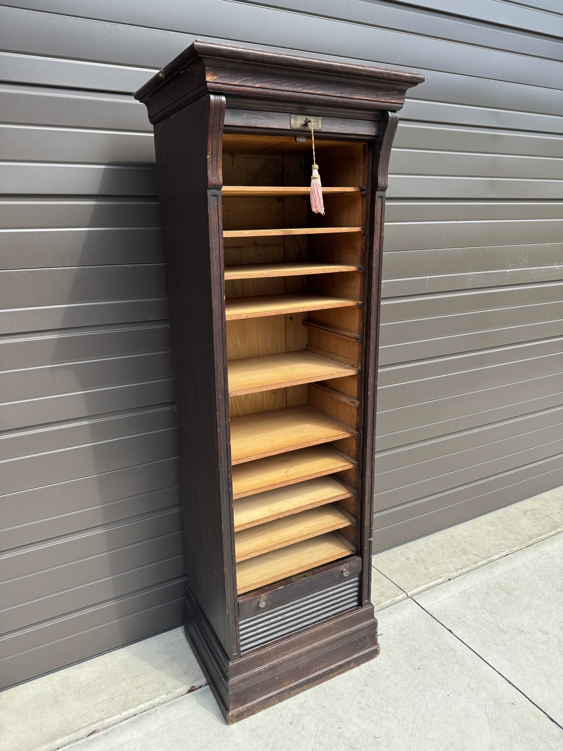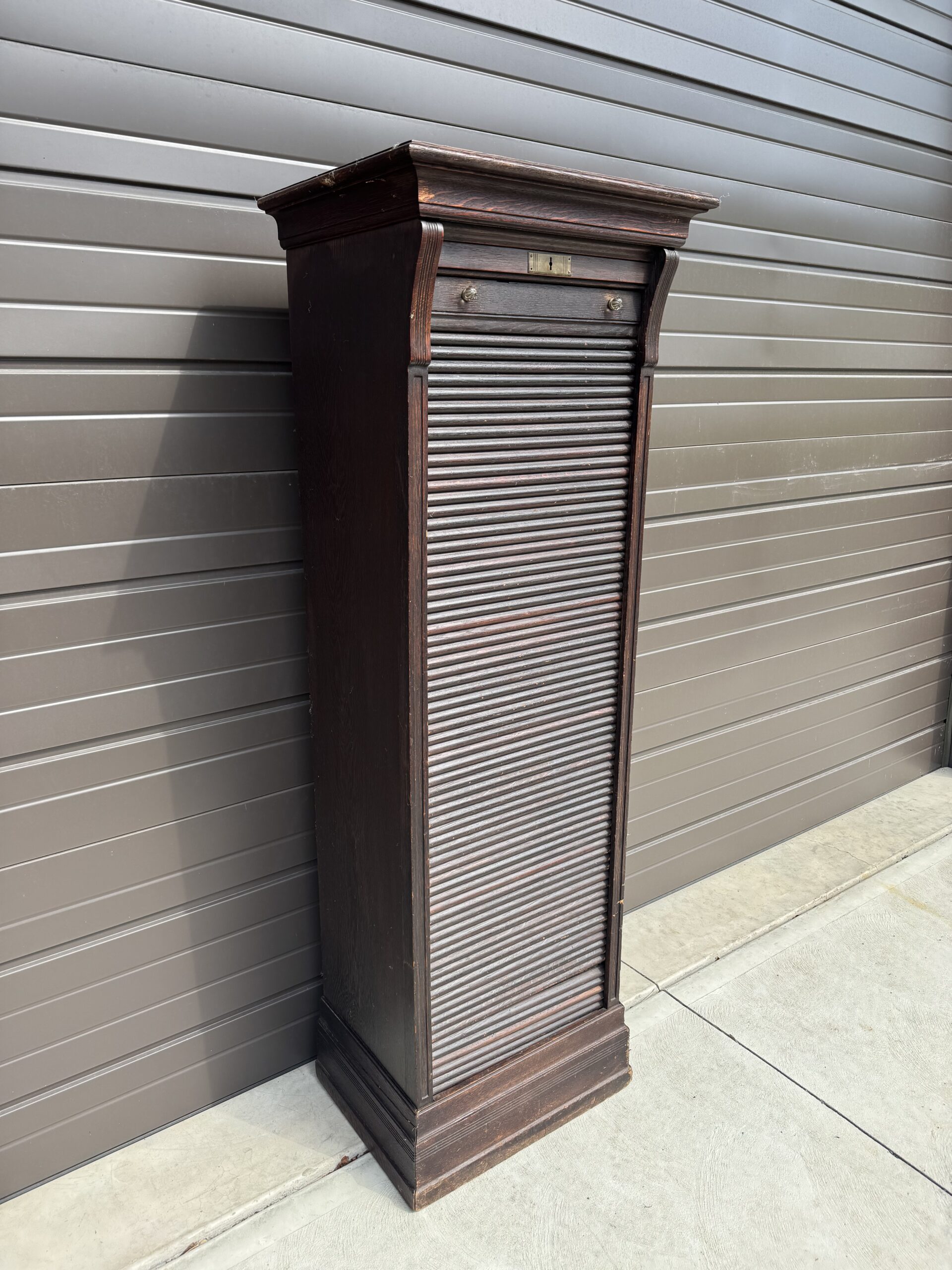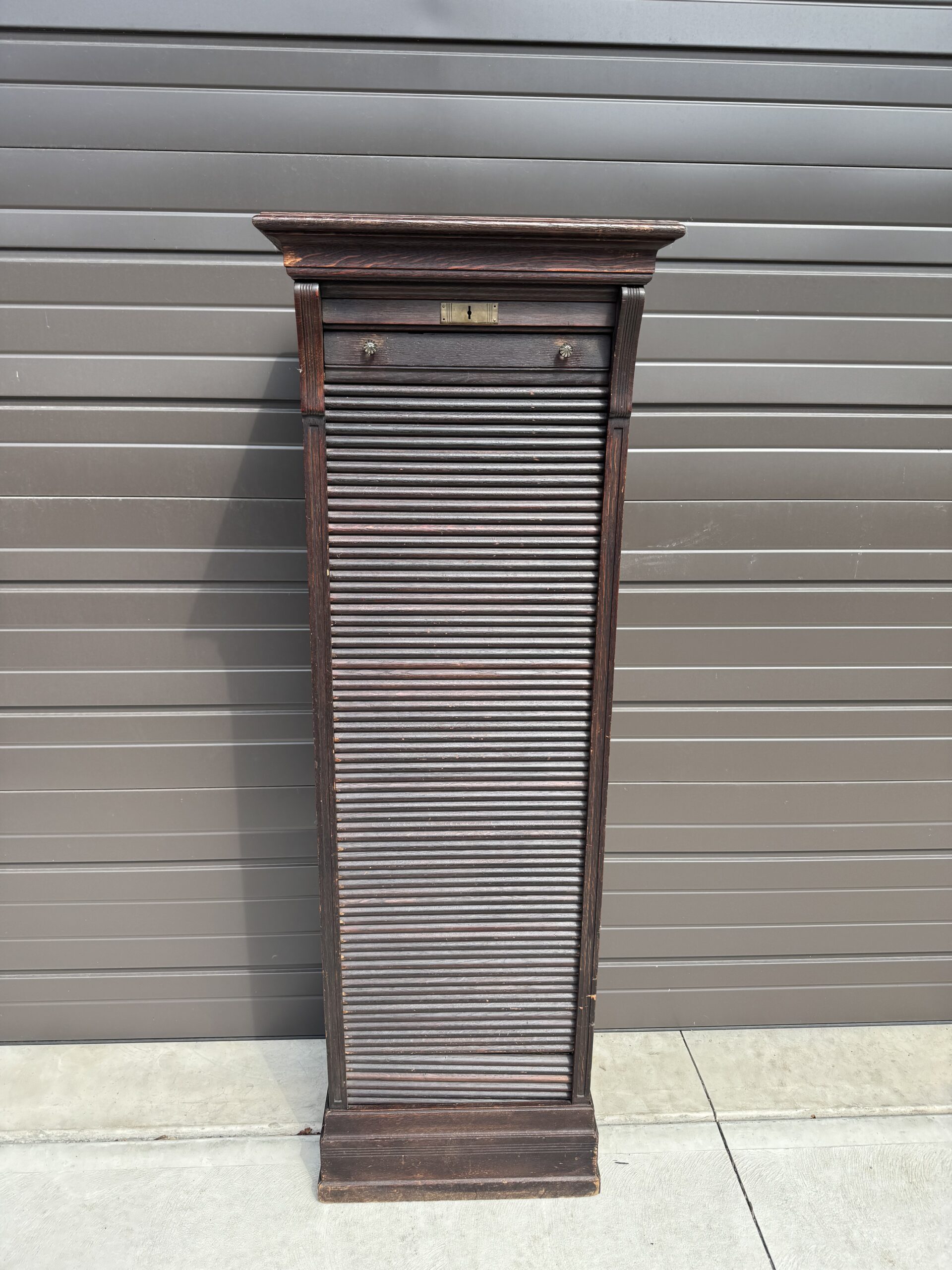 Has sliding tambour roll that pulls up and down from the bottom